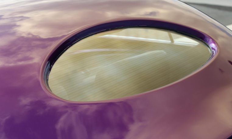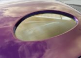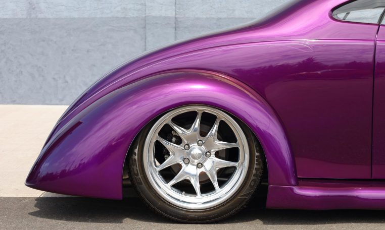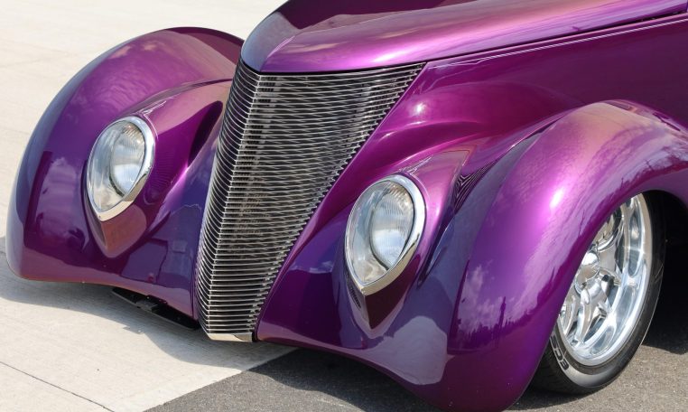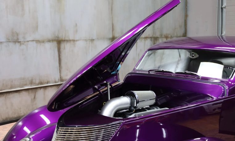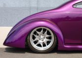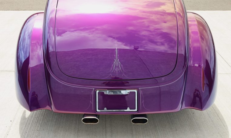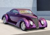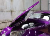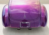 The smoothed fiberglass body has been painted Dupont Hot Hues Plum Passion Purple with flourishes, and top is metal. Turn signals are integrated into the mirrors, and the Hagen taillights are flush-mounted into the rear fender character line. The doors, hood, and trunk have poppers, and there is a remote for the hidden front plate.