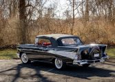 The car was repainted in black under prior ownership and features a power-operated black convertible top, a hood ornament, a fuel filler concealed above the left taillight, a continental spare tire kit, dual chrome mirrors, back-up lamps, and gold-color emblems.