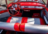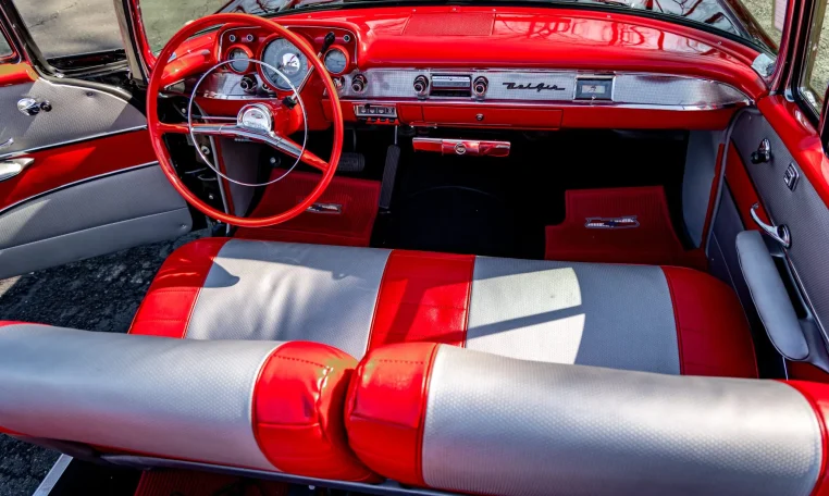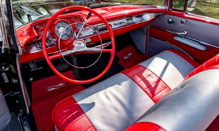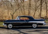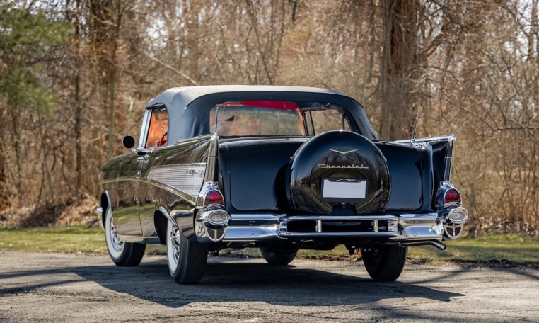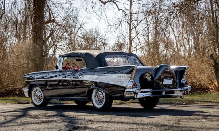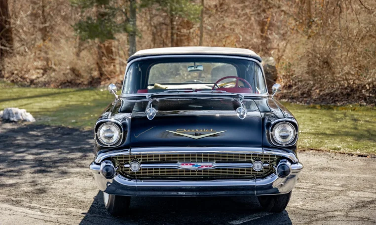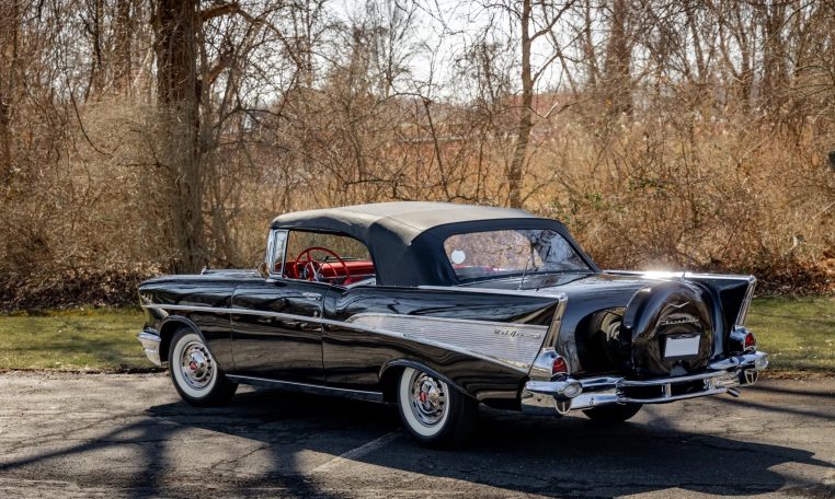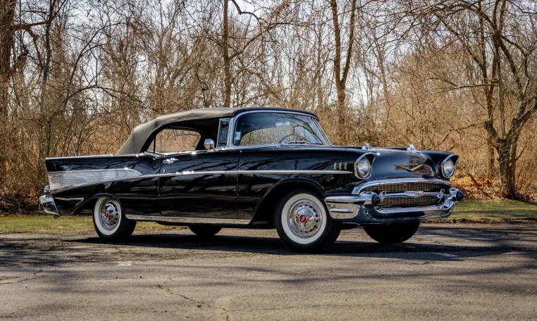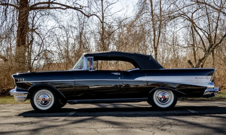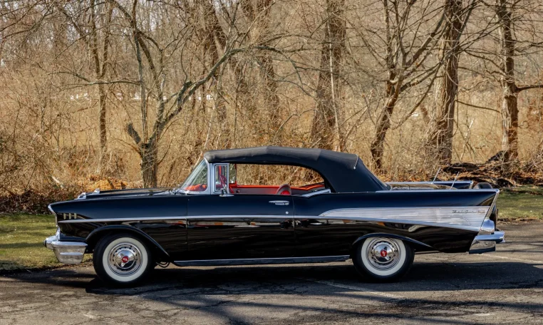 No Taxes & LicensingThis 1957 Chevrolet Bel Air convertible was refurbished before the owner purchased it in 2015, and it is powered by a 283ci V8 topped with dual four-barrel carburetors and paired with a two-speed automatic transmission. The car is finished in black over red and silver vinyl, and equipment includes a power-operated black convertible top, a continental spare tire kit, a Wonder Bar AM radio, a power-adjustable front seat, power windows, power brakes, and a dual exhaust system. The 283ci V8 is topped with dual four-barrel carburetors and Chevrolet-script valve covers. The fluids were serviced in December 2025.