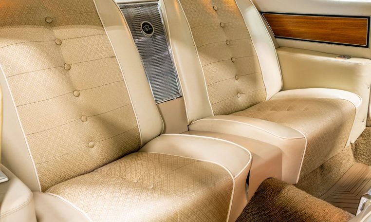 Cabin appointments include wood veneer accents on the center console and door panels, power window controls housed within the full-length armrests, a remote trunk release, air conditioning, and a Buick Sonomatic AM radio unit.