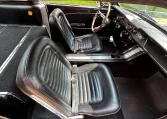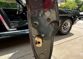 The cabin features front bucket seats and fold-down rear seats trimmed in black, and the car has a center console. A Hurst shifter and retro-look radio have been installed along with Rally Pac instruments and a woodgrain-rim steering wheel.