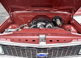 The cab was reupholstered in red vinyl with matching houndstooth cloth inserts, door panels, and carpets, the latter of which are reportedly fitted over Dynamat sound deadener. Amenities consist of an air conditioning system from Classic Auto Air and a RetroSound stereo with Bluetooth.