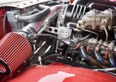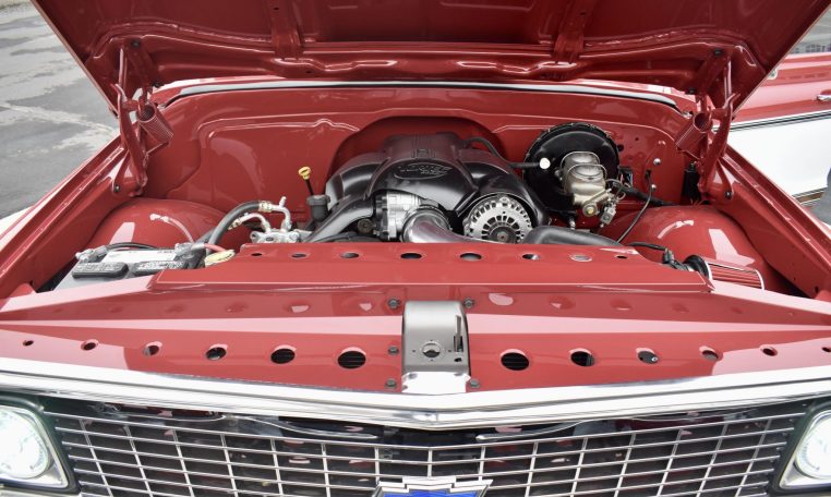 The 6.0-liter Vortec V8 features a custom air cleaner setup and was fitted using Dirty Dingo Motorsports mounts. The shaved and tucked engine bay also houses an aluminum radiator under a dimple-holed support.
