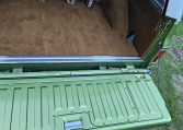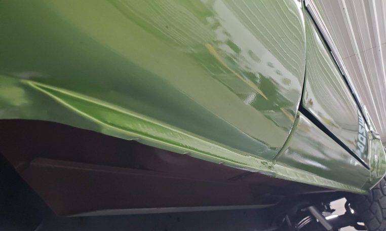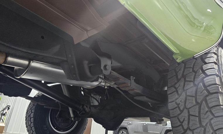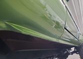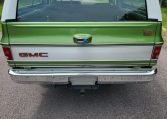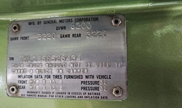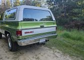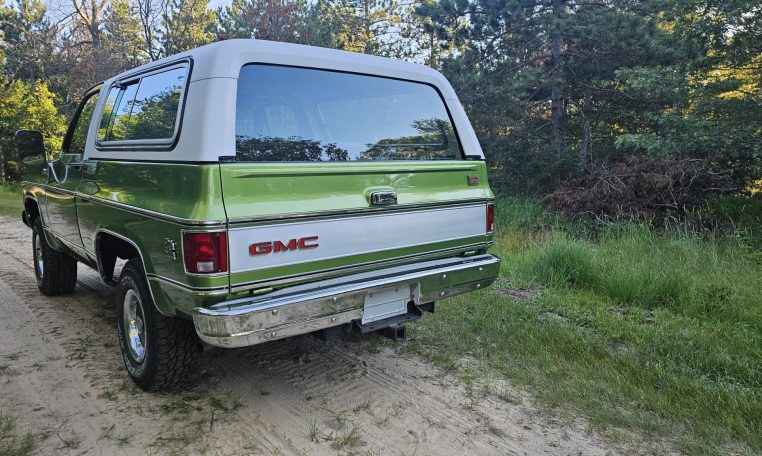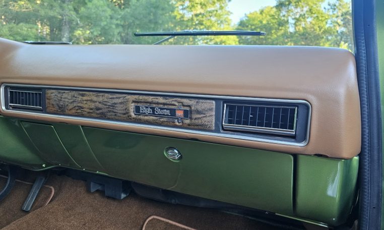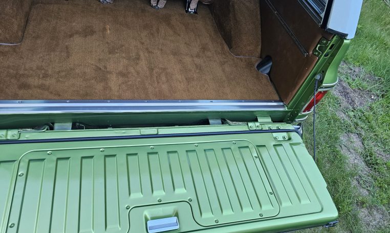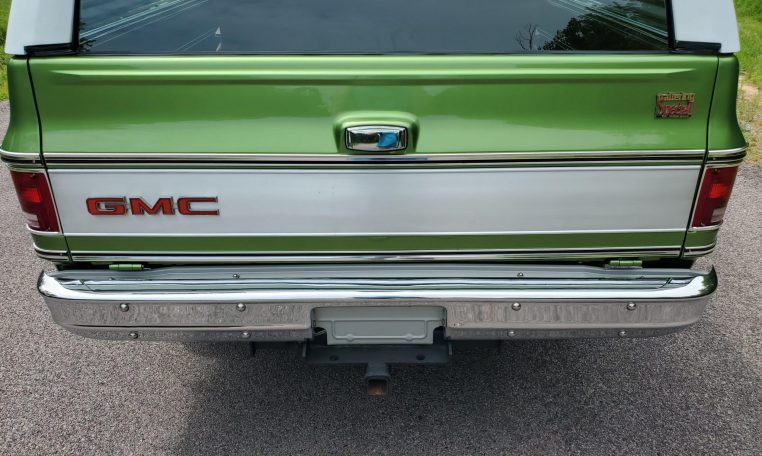 The truck was repainted in Medium Lime in 2021 and fitted with a white removable fiberglass hardtop with sliding side windows. Details include High Sierra badging, a receiver hitch, a brushed stainless steel tail panel, bodyside moldings, and chrome bumpers. Scuffs are present on the removable hardtop’s sliding side windows.